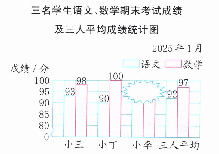 3.(五育并举)下面是三名学生语文、数学期末考试成绩及三人的平均成绩统计图。表示小李成绩的直条被墨水污染了,请你根据统计图算出他的语文、数学期末考试成绩。