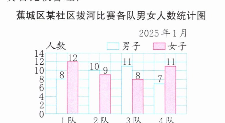 6.(五育并举)蕉城区某社区组织拔河比赛,下面是四个参赛小队现有男子、女子队员人数统计图。现又有8名男子和8名女子报名参赛,应该怎样分配这些新加入的参赛者比较合理?