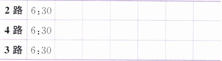 4. 2路公交车每5分钟一班,4路公交车每6分钟一班,3路公交车每10分钟一班。这三路公交车早晨6:30从公交总站同时发车,最少经过多长时间这三路公交车可以再次从公交总站同时发车?(先填表,再回答)