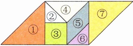 大平行四边形的面积:16×8=128(平方厘米) ①号板和⑦号板的面积:128÷2÷2=32(平方厘米) ④号板的面积:32÷2=16(平方厘米) ②号板和⑥号板的面积:16÷2=8(平方厘米) ③号板的面积:8×2=16(平方厘米) ⑤号板的面积:8×2=16(平方厘米) 解析:仔细观察拼成的平行四边形中的每一块板,它们的形状有平行四边形、三角形和正方形。两个大三角形的面积和是拼成的大平行四边形面积的一半;中等三角形的面积是大三角形面积的一半;每个小三角形的面积是中等三角形面积的一半;小正方形的面积是小三角形面积的 2 倍;小平行四边形的面积也是小三角形面积的 2 倍。