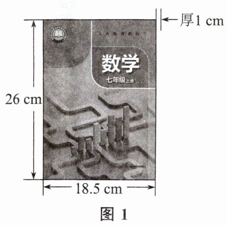 10. 书籍是人类进步的阶梯!为爱护书本,一般都将书本用包书纸包好.现有一本数学书籍,其长为26 cm,宽为18.5 cm,厚为1 cm,如图1.小军用一张长方形包书纸包好了这本数学书,他将封面和封底各折进去$x$ cm,包书纸展开后如图2所示.