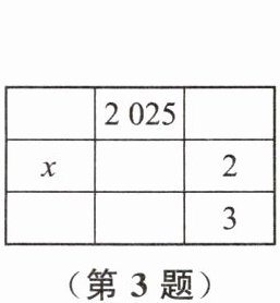 D 解析:如图,设正中间的数字为a.由题意可知,左上方的数字为2+3-2025=-2020.根据题意,得-2020+a+3=a+x+2,解得x=-2019.
