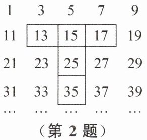 2. 将连续的奇数1,3,5,7,9,…按一定规律排成数阵,图中的T形框框住了五个数字,若将T形框上下左右移动,按同样的方式可框住另外的五个数,则框住的五个数的和不可能是( )