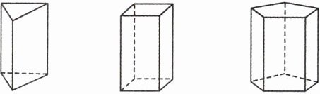 7. 如图,左边的几何体叫三棱柱,它有5个面,9条棱,6个顶点,中间和右边的几何体分别是四棱柱和五棱柱.