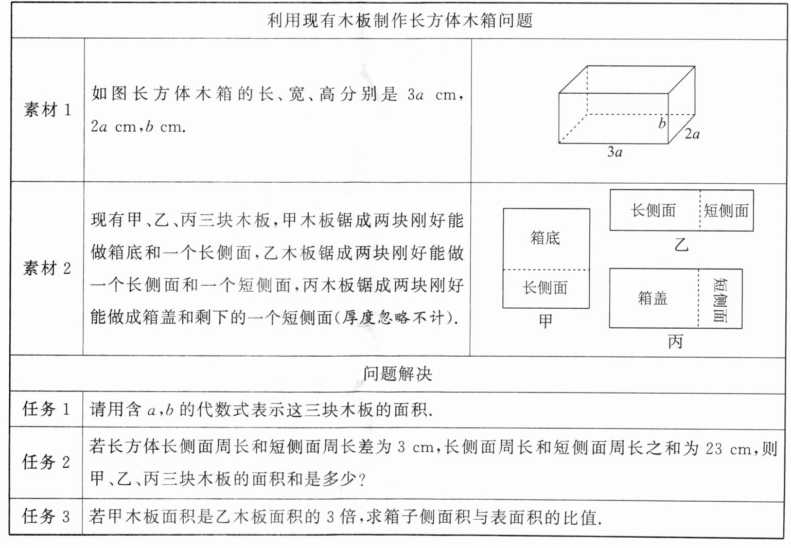| 任务3 | 若甲木板面积是乙木板面积的3倍,求箱子侧面积与表面积的比值. |