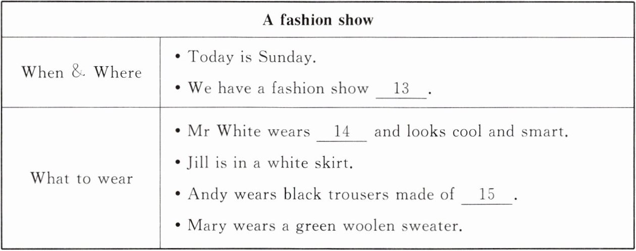 | What to wear | • Mr White wears 14 and looks cool and smart.• Jill is in a white skirt.• Andy wears black trousers made of 15 .• Mary wears a green woolen sweater. |