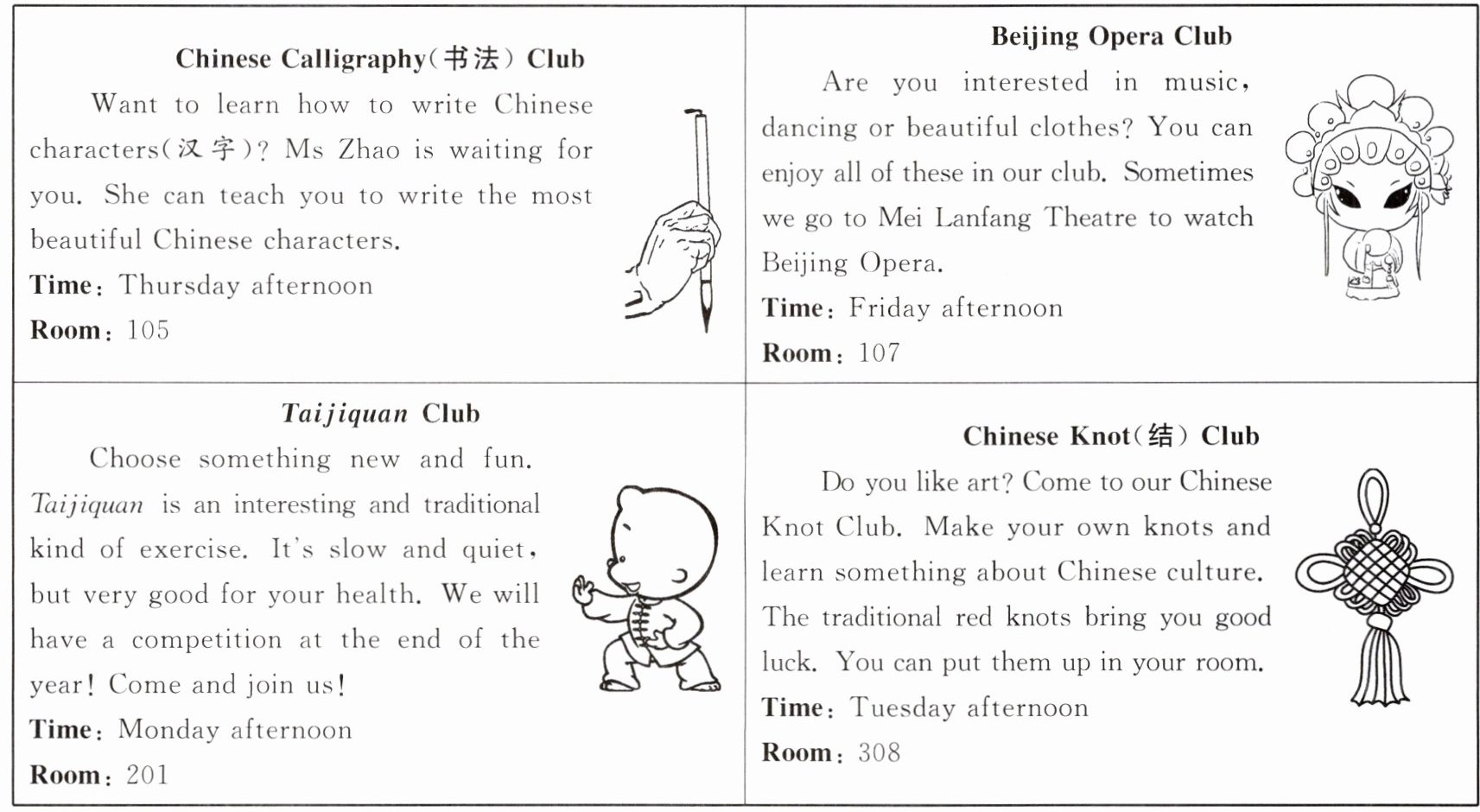 | Want to learn how to write Chinese characters(汉字)? Ms Zhao is waiting for you. She can teach you to write the most beautiful Chinese characters. Time:Thursday afternoon Room:105 | Are you interested in music,dancing or beautiful clothes? You can enjoy all of these in our club. Sometimes we go to Mei Lanfang Theatre to watch Beijing Opera. Time:Friday afternoon Room:107 |