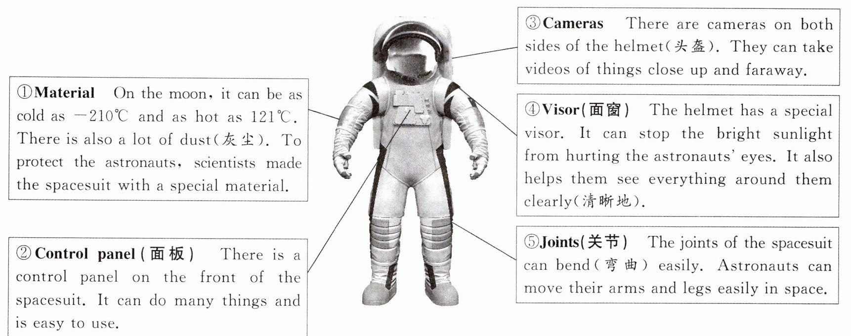 ①Material On the moon,it can be as cold as -210℃ and as hot as 121℃. There is also a lot of dust(灰尘). To protect the astronauts,scientists made the spacesuit with a special material.