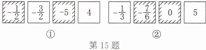 15. (新情境·游戏活动)小彬和小丽玩一个抽卡片的游戏,游戏规则如下:每人每次抽取4张卡片,如果抽到白色卡片,那么加上卡片上的数;如果抽到阴影卡片,那么减去卡片上的数(初始值均为0).比较两人抽取的4张卡片的计算结果,结果大的为胜者.小彬抽到了如图①所示的4张卡片,小丽抽到了如图②所示的4张卡片,最后获胜的是谁?