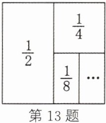 13. (数形结合思想)如图,把一个面积为1的正方形等分成两个面积为$\frac{1}{2}$的长方形,接着把一个面积为$\frac{1}{2}的长方形等分成两个面积为\frac{1}{4}$的正方形,再把一个面积为$\frac{1}{4}的正方形等分成两个面积为\frac{1}{8}$的长方形……依此类推,请运用图形中提示的规律计算:$\frac{1}{2}+\frac{1}{4}+\frac{1}{8}+\frac{1}{16}+\frac{1}{32}+\frac{1}{64}+\frac{1}{128}= $______.