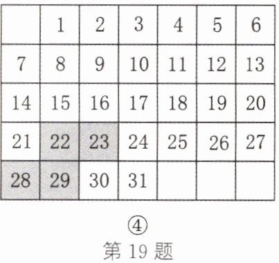 19. 如图①所示为某月的月历,涂色框中的4个数均满足“两条斜对角线上的两个数的和相等”.探究过程:设涂色框左上角的数为x,则涂色框中的4个数的表示如图②所示.因为两条斜对角线上的两个数的和分别为$x + (x + 8) = 2x + 8$,$(x + 1) + (x + 7) = 2x + 8$,所以$x + (x + 8) = (x + 1) + (x + 7)$.所以涂色框中的4个数均满足“两条斜对角线上的两个数的和相等”.