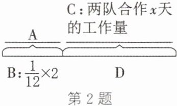 2. 有一道条件缺失的问题:一项工程,甲队单独做需要12天完成,乙队单独做……还需要几天完成这项工程?根据标准答案,老师在黑板上画出线段示意图(如图),设两队合作还需要x天完成这项工程,并列方程为$\frac{1}{12}×2+(\frac{1}{8}+\frac{1}{12})x= 1$. 根据以上信息,下列结论不正确的是( )
