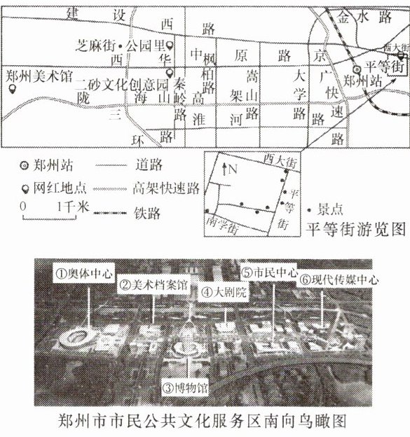近年来,郑州市将一些旧城街道、废弃工业厂区进行了改造,使其成为热门的“网红地点”。假期期间,你的朋友小明专程乘坐火车到郑州市网红地点打卡。下图为郑州市网红地点示意图及平等街游览图和郑州市市民公共文化服务区南向鸟瞰图。