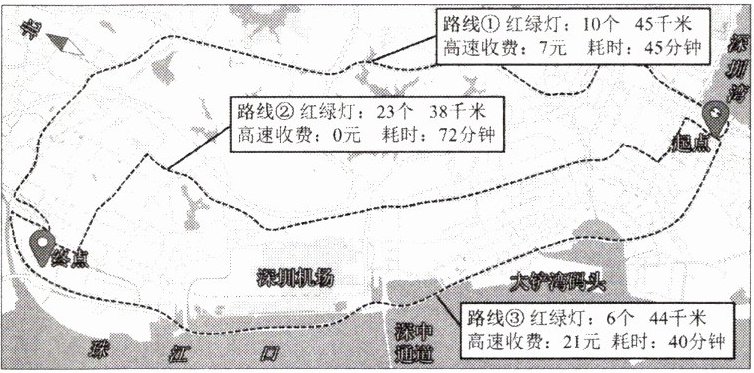 家住南山区(起点)的小洲一家驾车前往宝安区的海上田园(终点)游玩,在电子地图上查询到三条路线方案,下图示意三条路线方案及其相关信息。据此完成 8~10 题。