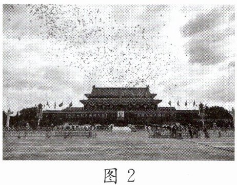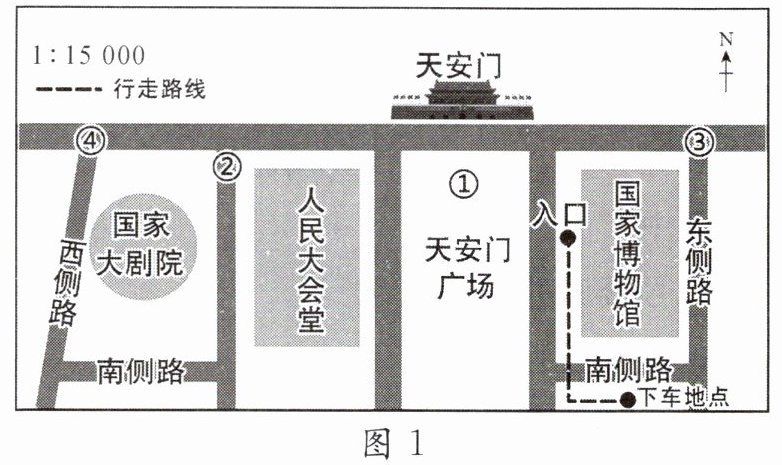 国庆期间,福州中学生小闽一家使用电子地图导航自驾去北京天安门广场观看升旗仪式。图 1 为天安门地区平面图,图 2 为小闽拍摄的照片。据此完成 11~12 题。