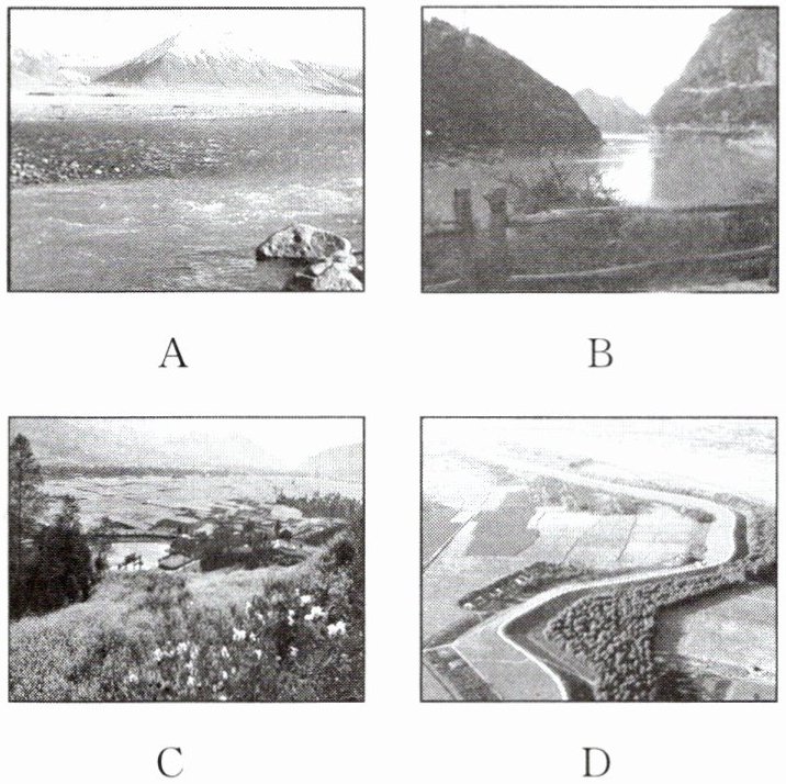 8. 小明的爸爸是一位野外地质工作者,在考察长江的过程中,他拍摄了几幅长江流经地区的照片。请根据描述判断拍摄处的地形,并找到相应的图片。