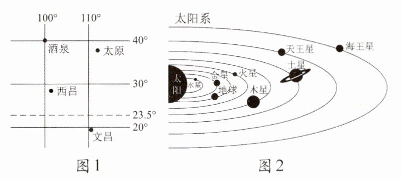 16. 【聚焦航天助推强国】航天梦是强国梦的重要组成部分。探索浩瀚宇宙,发展航天事业,建设航天强国是我国航天人不懈追求的航天梦。随着中国航天事业快速发展,中国人探索太空的脚步会迈得更大、更远。图 1 为中国四大卫星发射基地位置图,图 2 为太阳系八大行星示意图。读图,回答下列问题。(5 分)