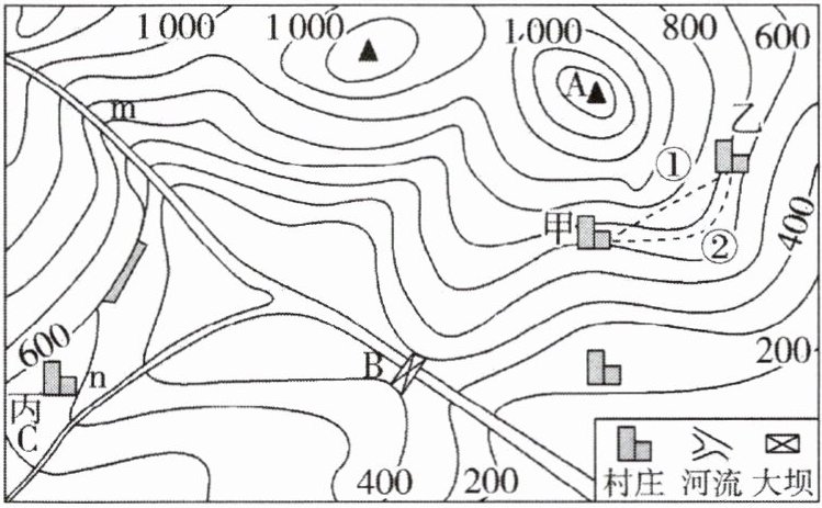 (4)为改善甲、乙两村之间交通条件,政府在图示①②方案中选择线路②修建了一条公路。请你说出线路②的优势。(3 分)