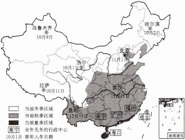 (湘潭中考)从气候学上来说,连续五天日平均气温在 $10^{\circ}C$ 以下算作冬季,因此我国各地入冬时间不同。下图是某年某月我国各地所处的季节及部分城市常年入冬时间示意图。读图,完成 7~8 题。