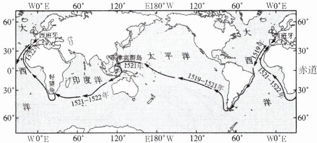 麦哲伦船队的船员们回到西班牙后,得到的许多礼物中就有一件是地球仪。在地球仪上写着这样一句话——“你首先拥抱了我!”读麦哲伦环球航行路线图,完成6~7题。