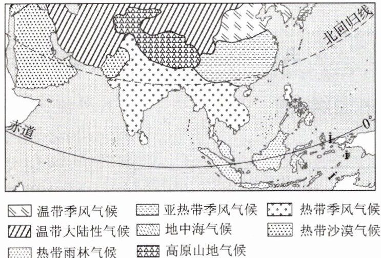 (1)我国长江以南地区为亚热带季风气候,而同纬度的阿拉伯半岛主要为热带沙漠气候。