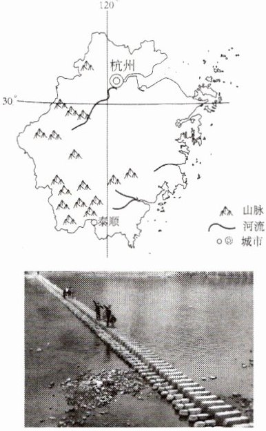 我国东南丘陵地区沟谷、溪流众多,古人为了过溪涉水,多取石在溪间铺就便道,建碇步桥。除洪水多发季节,均可畅行。春晚舞蹈《碇步桥》取材于浙江省泰顺县,下图示意泰顺县位置和碇步桥景观。据此完成11~13题。
