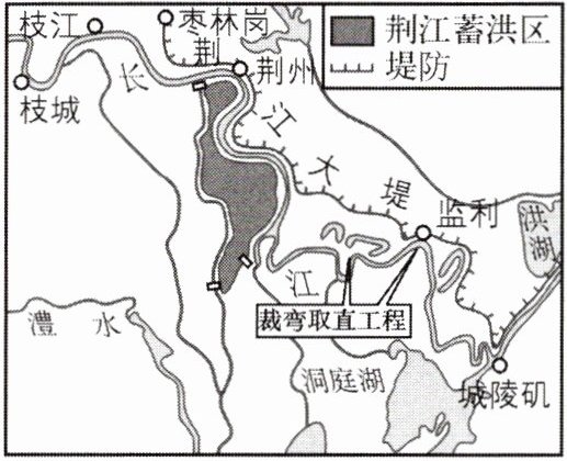 (枣庄中考)荆江是指从湖北枝城到湖南城陵矶河段,此处河道弯曲,水流不畅,易发生洪涝灾害。读图,完成9~10题。