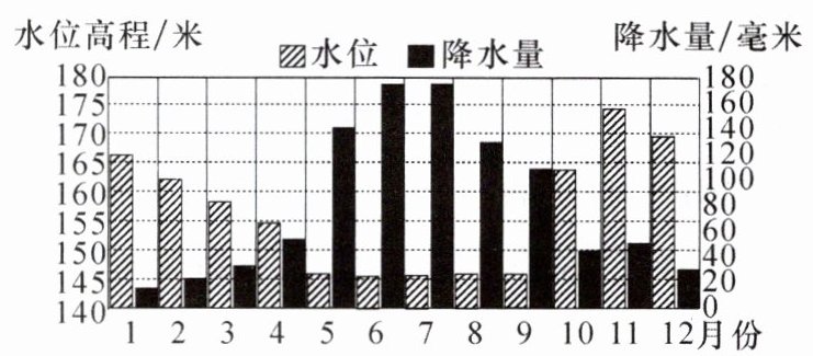 为充分发挥防洪、发电、航运、供水等多种功能并兼顾环境效益,三峡水库采取“蓄清排浑”的运行方式。“蓄清排浑”即汛期排出“浑水”(含沙量大的水),汛后蓄满“清水”(含沙量小的水)。图为三峡库区月平均降水量和三峡水库月平均水位高程图。据此完成11~13题。