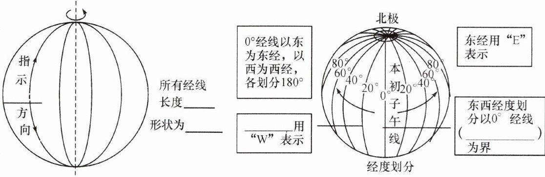 1.南北 相等 半圆 西经 本初子午线
