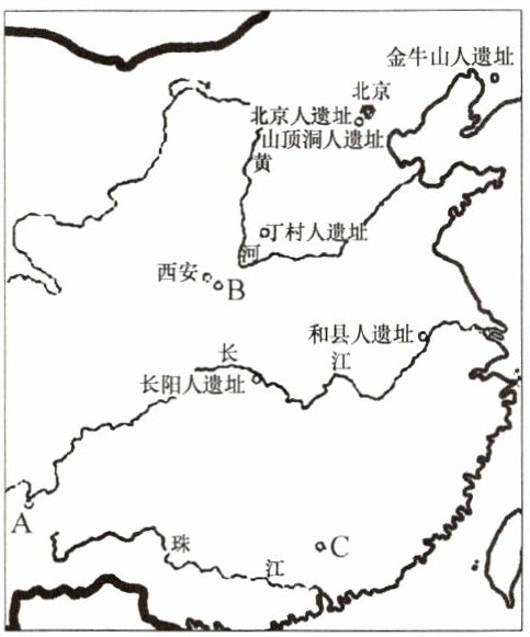 (2) 从上图中看,我国古人类遗址在分布上有什么特点?(1分)