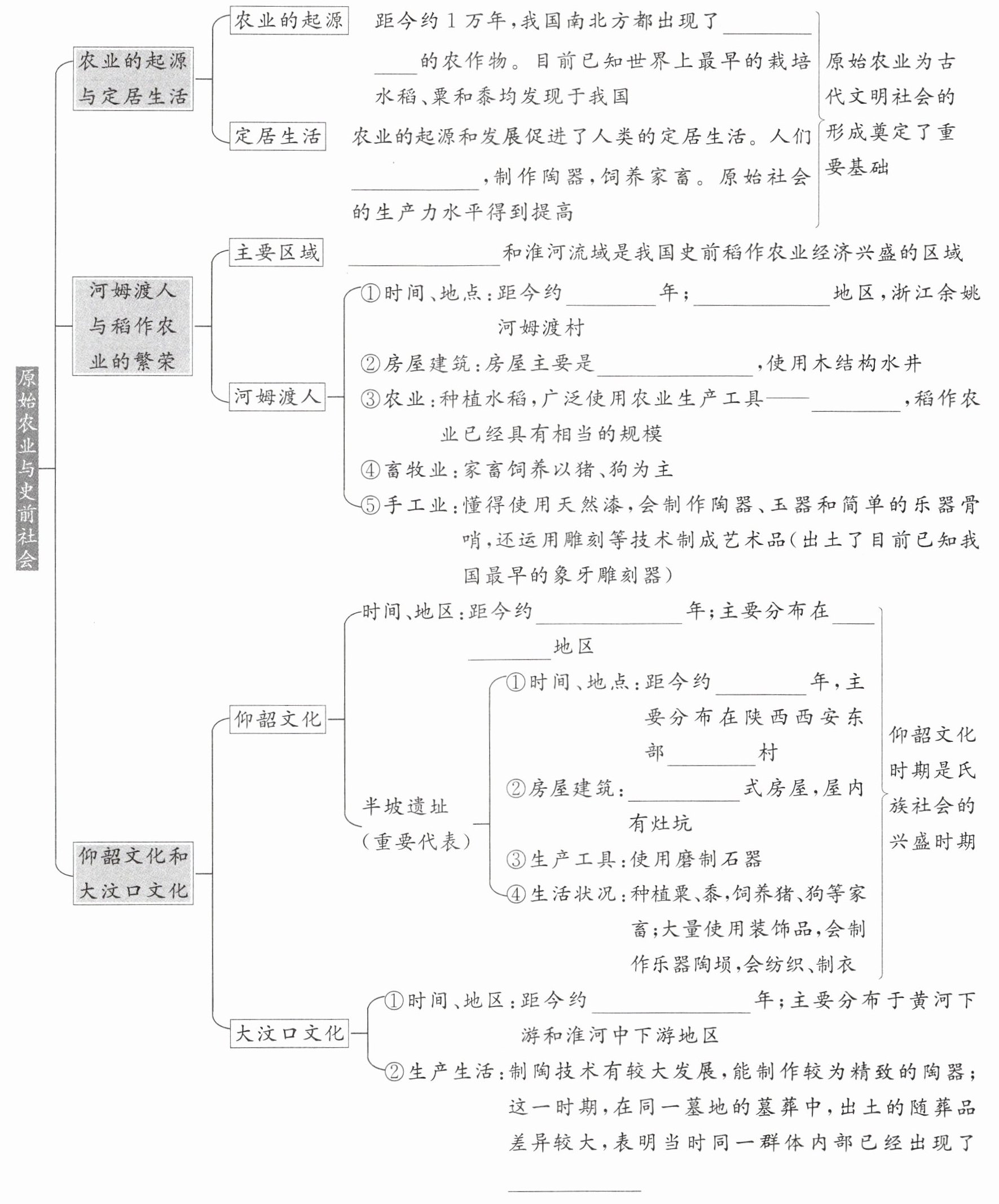 答案: 人工栽培 磨制石器 长江中下游 7000 长江下游 干栏式建筑 骨耜 7000—5000 黄河中游 6000 半坡 半地穴 5900—4400 贫富分化