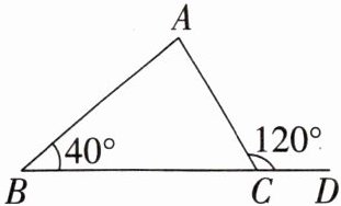 例4 如图,在$△ABC$中,点 D 是 BC 延长线上一点,$∠B= 40^{\circ },∠ACD= 120^{\circ }$,则$∠A$等于 (