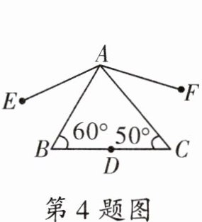 4. 如图,在$△ABC$中,$∠B = 60^{\circ}$,$∠C = 50^{\circ}$,点D是BC上的点(点D不与B、C重合),点E和点F分别是点D关于AB和AC的对称点,连结AE和AF,则$∠EAF$的度数是(