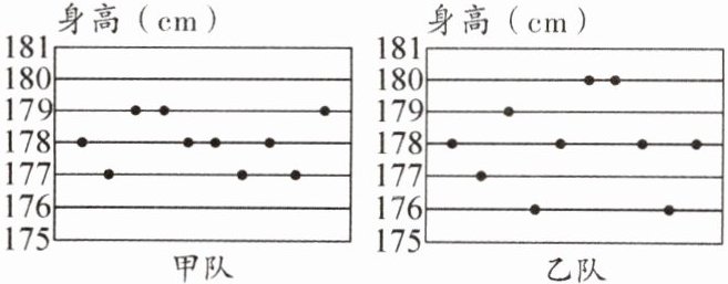 9. 甲、乙两支仪仗队各有10名队员,队员的身高(单位:cm)用小圆点标在下面的统计图中,根据图中表述的信息,请判断甲、乙两队队员身高数据的方差的大小关系是$s_{甲}^{2}$