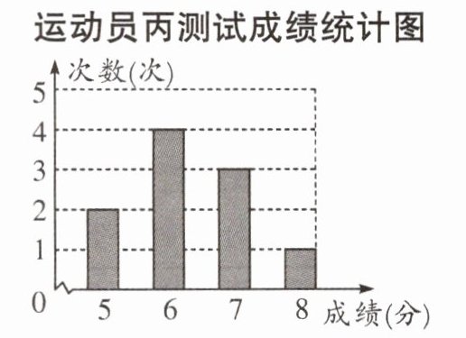 运动员丙测试成绩的平均数为$ \frac { 2 × 5 + 4 × 6 + 3 × 7 + 1 × 8 } { 2 + 4 + 3 + 1 } = 6. 3 $(分).