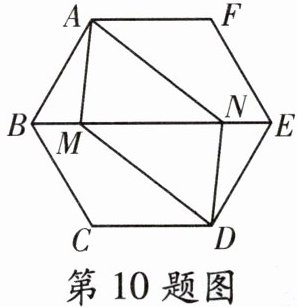 10. 如图,在正六边形ABCDEF中,M、N是对角线BE上的两点。添加下列条件中的一个:①$BM= EN$;②$∠FAN= ∠CDM$;③$AM= DN$;④$∠AMB= ∠DNE$。能使四边形AMDN是平行四边形的是______(填上所有符合要求的条件的序号)。