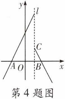 4. 定义图象与$x轴有两个交点的函数y= \begin{cases}-2x+4(x≥m)\\2x+4(x<m)\end{cases} $,叫做关于直线$x= m$的对称函数,它与$x轴负半轴的交点记为A$,与$x轴正半轴的交点记为B$。例如,如图:直线$l:x= 1$,关于直线$l的对称函数y= \begin{cases}-2x+4(x≥1)\\2x+4(x<1)\end{cases} $,与该直线$l交于点C$,当直线$y= x与关于直线x= m$的对称函数有两个交点时,则$m$的取值范围是(