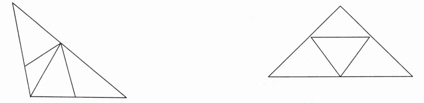 【解析】:本题主要考查等边三角形的性质以及图形的分割。等边三角形的三条边都相等,三个角也都是$60^{\circ}$。要把一个大等边三角形分成四个大小相同的小等边三角形,可以通过连接大等边三角形三边的中点来实现。因为连接三边中点后,根据三角形中位线定理,可以得到四个小等边三角形,它们的边长都是大等边三角形边长的一半,且形状和大小都相同。