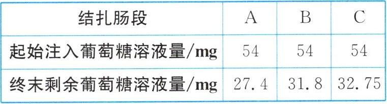 (3)为验证上述假设,同学们分别从三个部位各选取30cm的肠段A、B、C,并在两端进行结扎处理,随后向不同肠段内注入54mg的葡萄糖溶液,30min后测定肠段内剩余葡萄糖溶液量。本实验共重复了6次,计算测定数据的平均值,获得结果如下表。