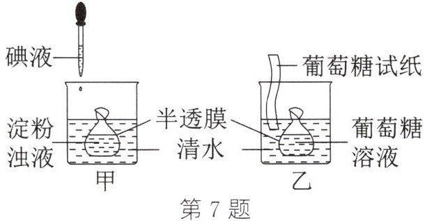 7. (核心素养)模拟实验能够让抽象复杂的事物变得直观易理解。小明尝试通过模拟实验来学习小肠的功能,如图,在半透膜内分别加入淀粉浊液和葡萄糖溶液,并放入装有清水的甲、乙烧杯中,静置一段时间后分别加入碘液和葡萄糖试纸(已知该试纸为蓝色,与葡萄糖溶液接触后变黄色)。