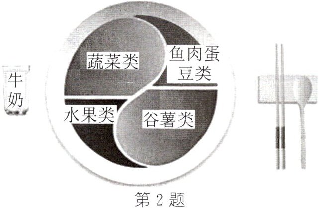 2. 《中国居民膳食指南(2022)》通过平衡膳食餐盘(如图)宣传平衡膳食的理念。下列相关叙述错误的是( )
