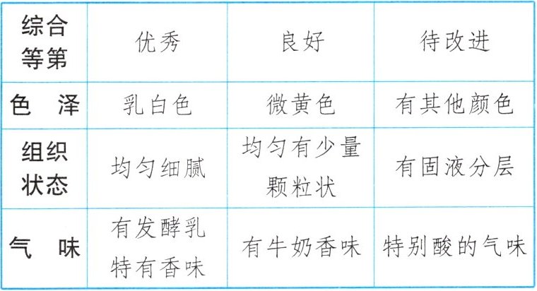 (3)小科取出妈妈自制的酸奶,取了一小杯,发现色泽呈乳白色;用汤匙搅拌,均匀且细腻;而且有酸奶特有的香味。小科根据说明书上的评价标准,给妈妈打了一个综合等第为______。