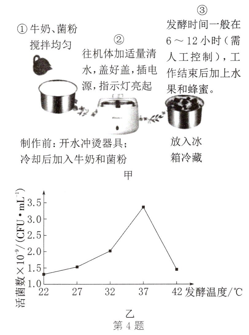 (2)发酵时酸奶机内部是恒温设置,小科很好奇酸奶机内部设置的温度,查阅资料获得乳酸菌活菌数与发酵温度的关系图(如图乙),小科分析图后认为酸奶机内部的温度应该设置为______才能制作最佳的酸奶。