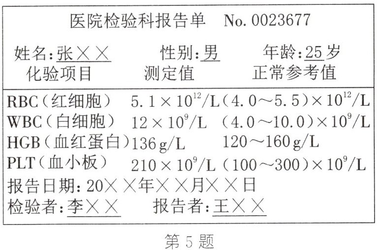 5.(2023·苏州)以下为张××的血常规化验单(显示部分内容)。根据化验结果推测,他最可能患有( )