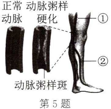 5. 血液中脂肪含量若长期过高,则会在动脉壁上沉积,使得动脉弹性降低、管腔变窄,即动脉粥样硬化。下列叙述错误的是( )