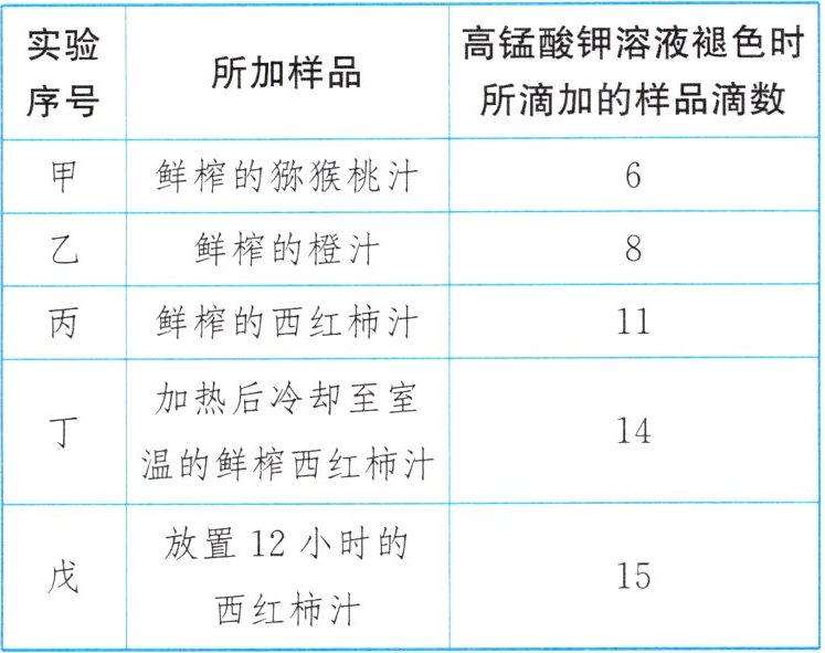 11. 已知:维生素C能使紫色的高锰酸钾溶液褪色,小育利用维生素C的这个性质比较食品中维生素C的含量,进行了如下研究,实验操作如图,记录结果如下表。请回答:
