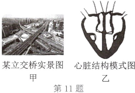 11. (新情境)立交桥是交通枢纽,心脏是血液循环枢纽。让我们通过类比的方法,理解心脏结构与功能的关系。据图回答问题: