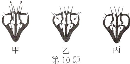 C 解析:甲图表示左右心室收缩,血液由心室流向动脉,A错误。乙图表示心房和心室均舒张,血液由全身各处流回心房,心脏中有瓣膜,血液不能由心室流向心房,B错误。心脏跳动一次,就是心脏收缩和舒张各一次。心脏每次跳动的过程是先两个心房收缩,此时两个心室舒张,心房与心室之间的瓣膜处于打开状态,而动脉基部的瓣膜处于关闭状态,血液由心房流向心室;接着两个心房舒张、两个心室收缩,心房与心室之间的瓣膜处于关闭状态,而动脉基部的瓣膜处于打开状态,血液由心室经主动脉和肺动脉泵出;然后两个心房和两个心室均舒张,动脉基部的瓣膜处于关闭状态,血液经肺静脉和上、下腔静脉流向心房,C正确。丙图表示左右心房收缩,心房与心室之间的瓣膜打开,动脉基部的瓣膜关闭,血液由心房流向心室,D错误。
