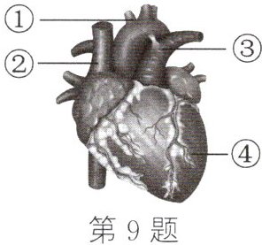 9. 如图是人的心脏的外形示意图,请据图回答问题: