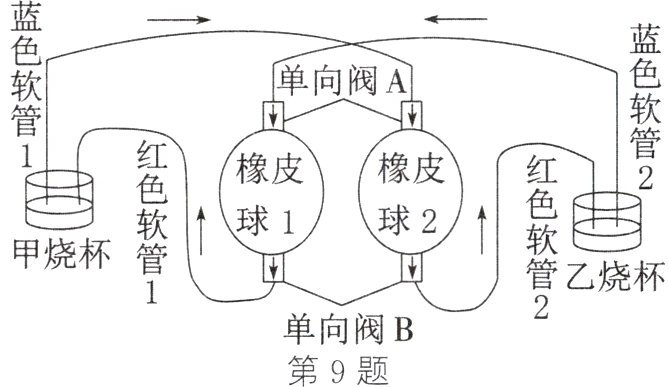 9. (核心素养)如图为某同学在校园科技节上的参赛作品——血液循环演示模型,其中单向阀模拟瓣膜(箭头表示液体流动方向),软管模拟与心脏相连的血管,装置内的红墨水模拟血液。据图回答: